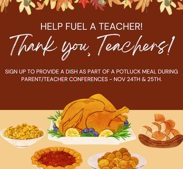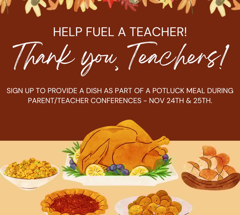 During conference week, we aim to bless our hardworking teachers with warm meals to help them through long days of meeting with families. This is one of the most meaningful ways we show appreciation and support. Families can volunteer by preparing or dropping off dishes, drinks, or desserts.